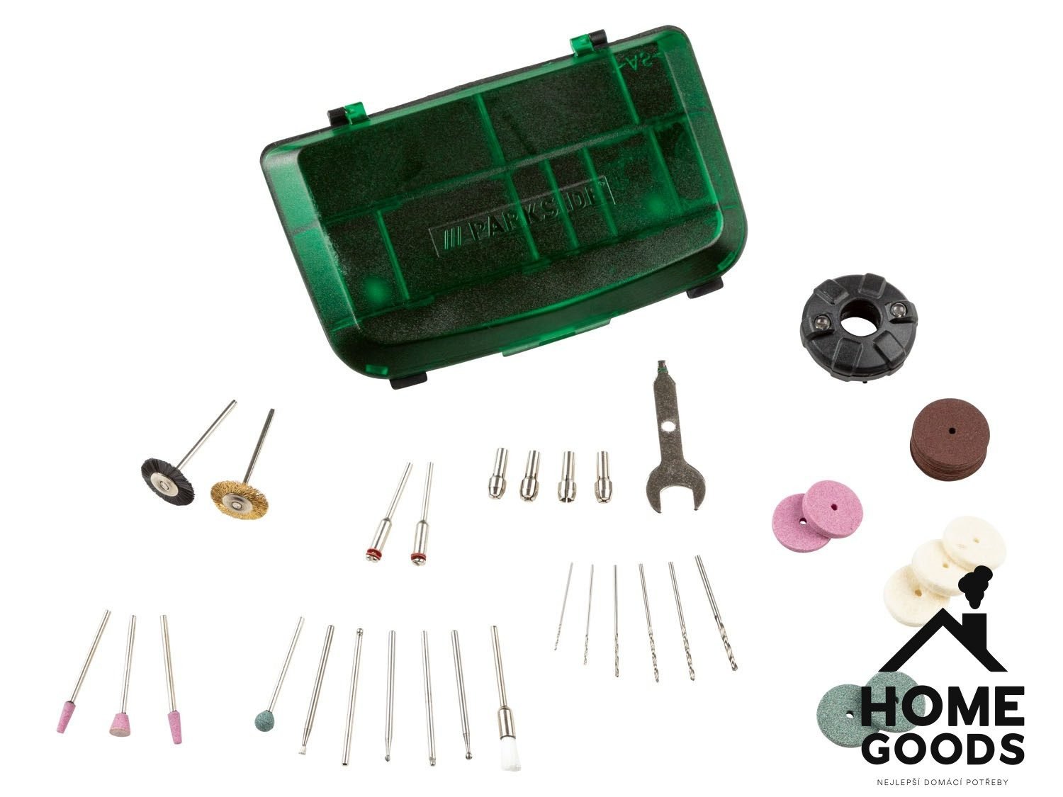 • 47 nástavců: 5 kleštin, 6 HSS vrtacích korunek, 16 řezacích kotoučů, 4 brusné kotouče, 3 lešticí kotouče, 5 brusných bitů, 3 frézovací bity, 2 gravírovací bity, 2 plastové kartáčky, 1 kovový kartáček