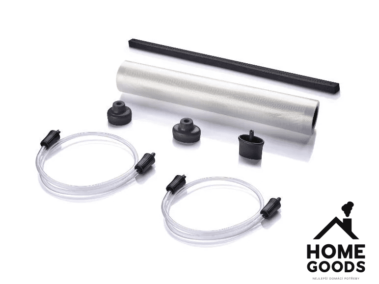 - Včetně náhradního těsnění, role se 3 m fólie, 2 vakuovacích hadiček a 3 adaptérů vakuového ventilu